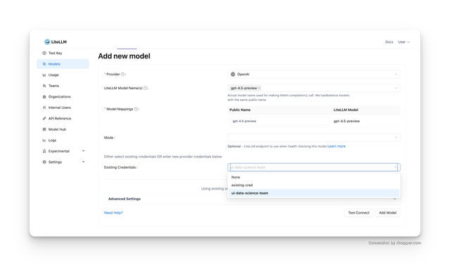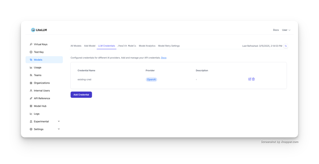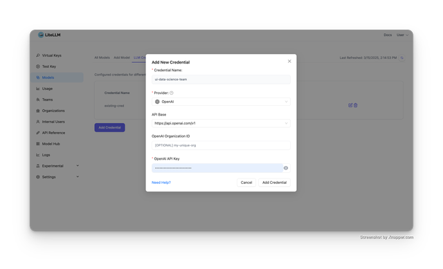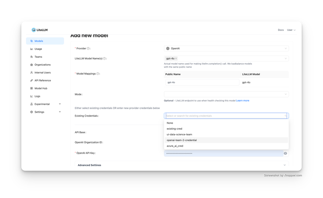 You can add LLM provider credentials on the UI. Once you add credentials you can re-use them when adding new models